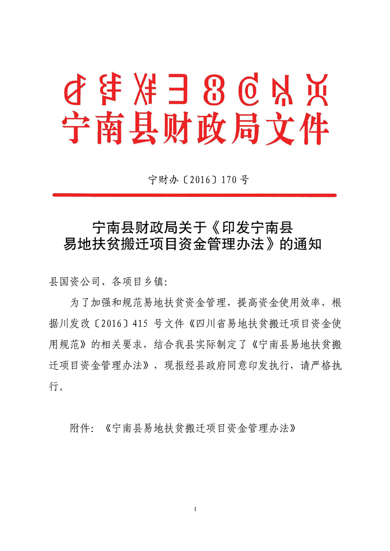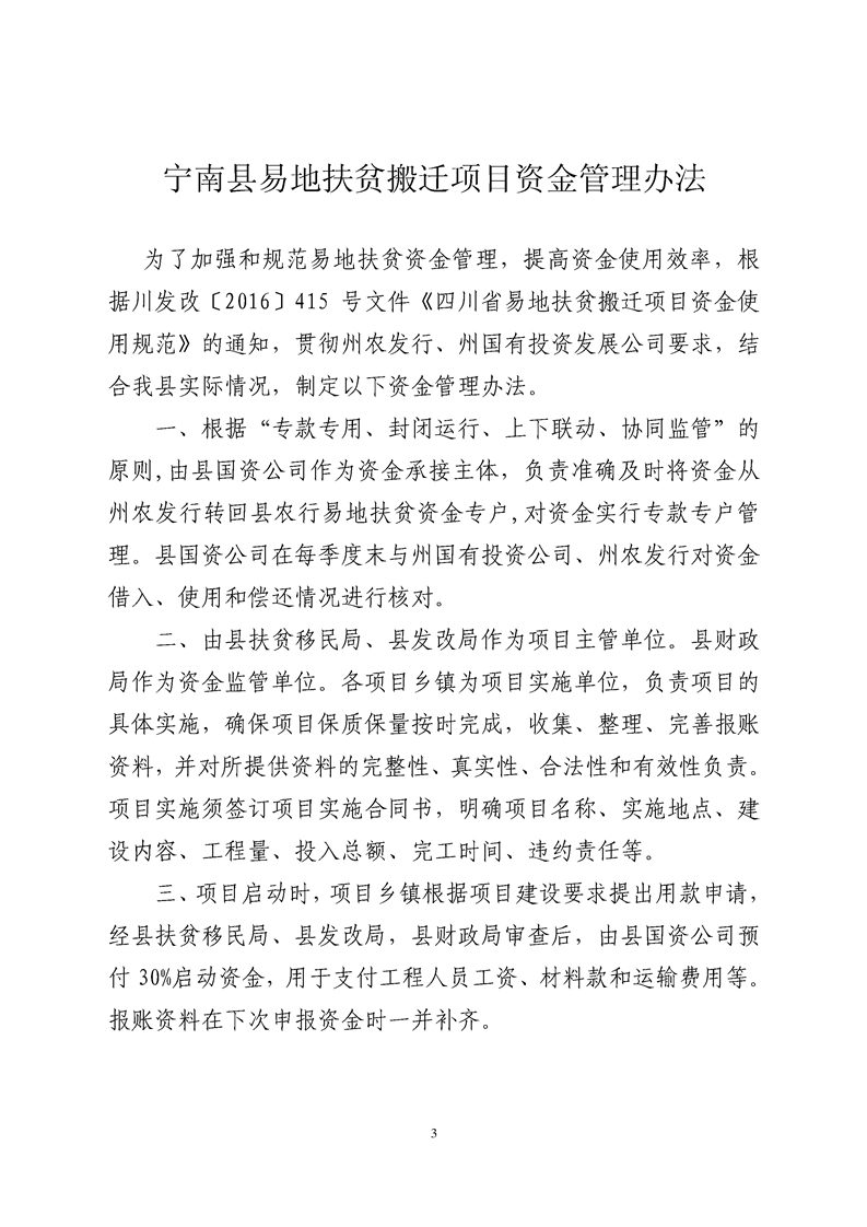宁南县财政局关于印发《宁南县易地扶贫搬迁项目资金管理办法》的通知