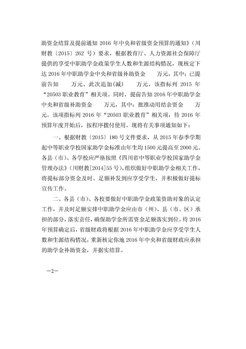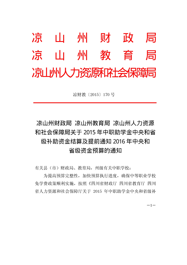 凉山州财政局、凉山州教育局、凉山州人力资源和社会保障局关于2015年中职助学金中央和省级补助资金结算及提前通知2016年中央和省资金预算的通知