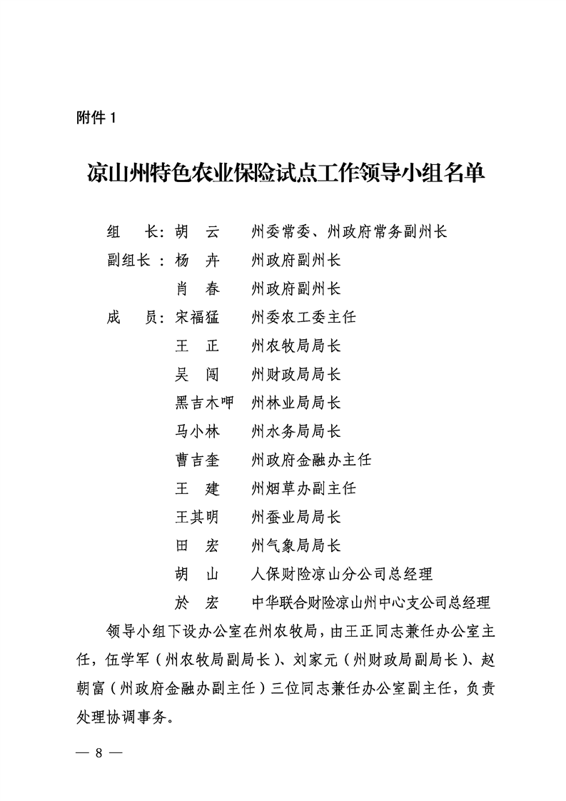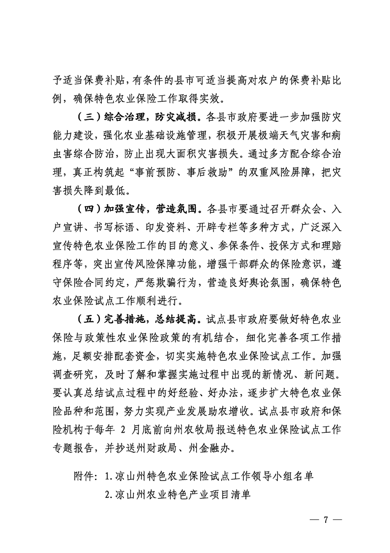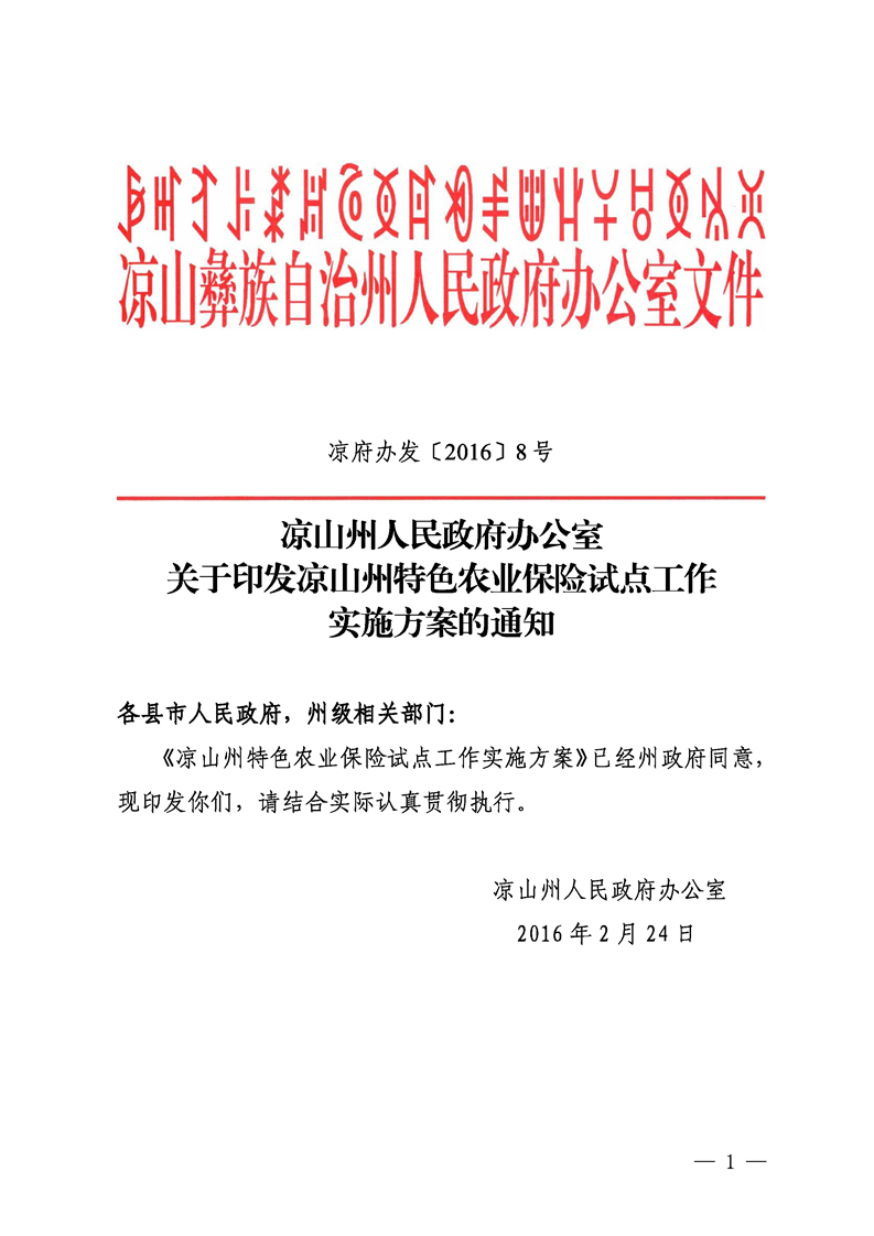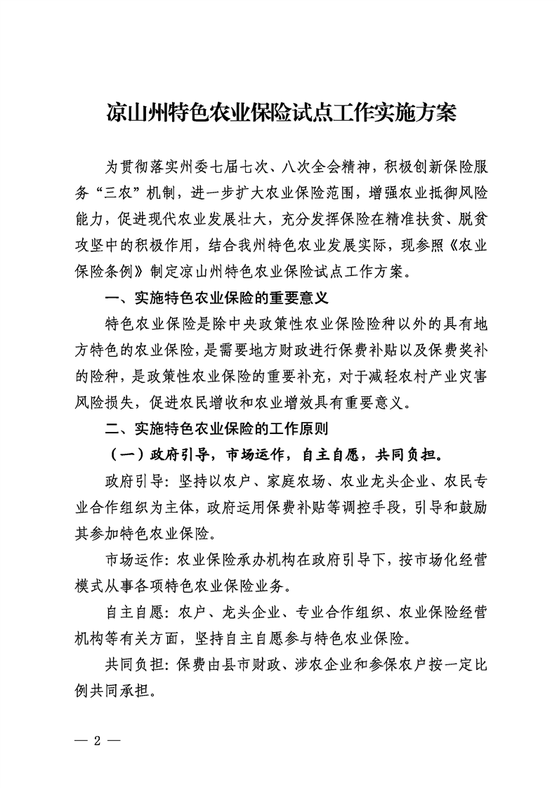 凉山州人民政府办公室关于印发凉山州特色农业保险试点工作实施方案的通知